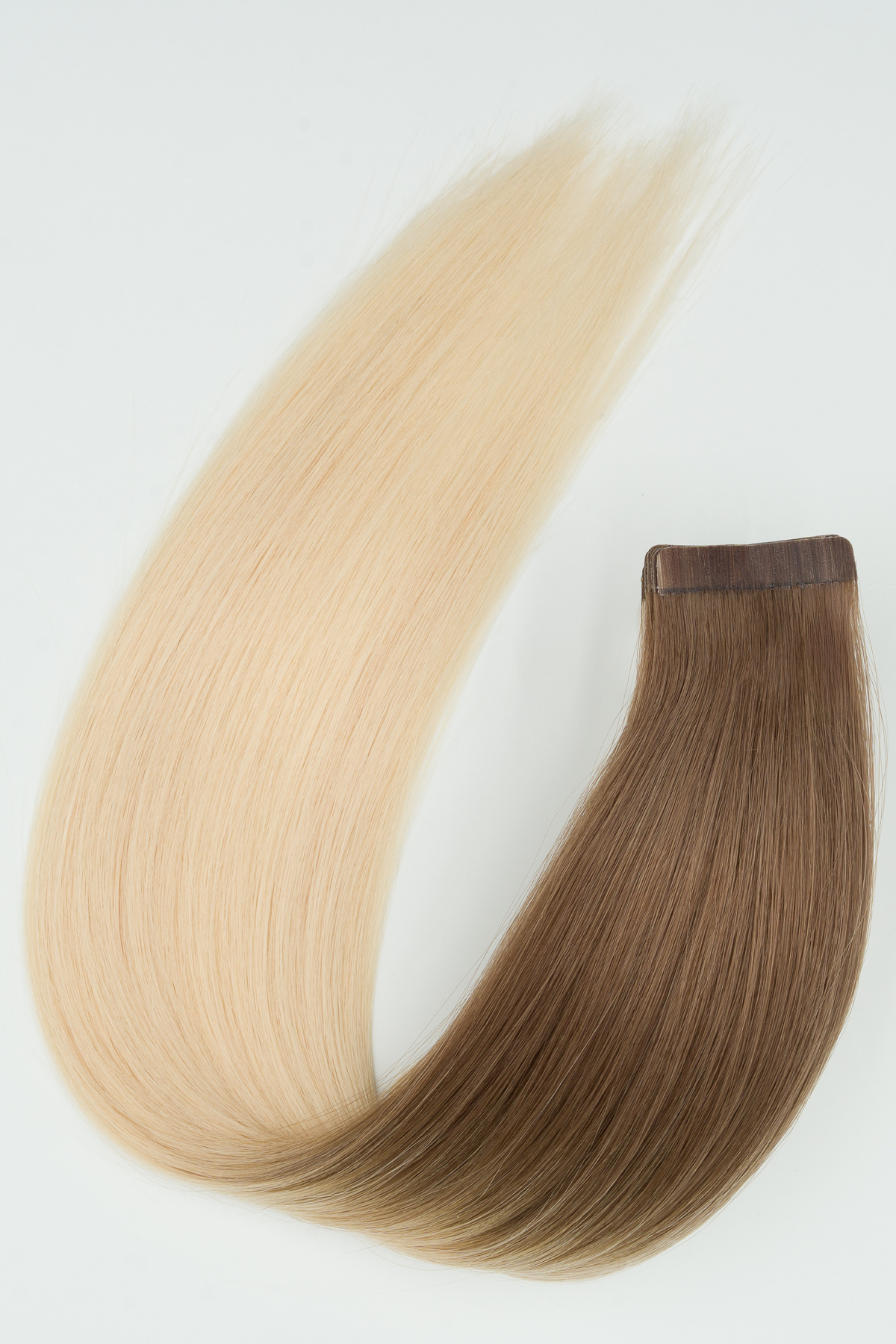 We offer our human hair tape extensions, which are coloured using the balayage technique, with a shorter and a longer base and in three different lengths. For the design with the shorter base, the colour gradient starts after approx. 5 cm; for the design with the longer gradient, after approx. 15 cm. This allows you to create a very individual look depending on your hairstyle preference and hair length.