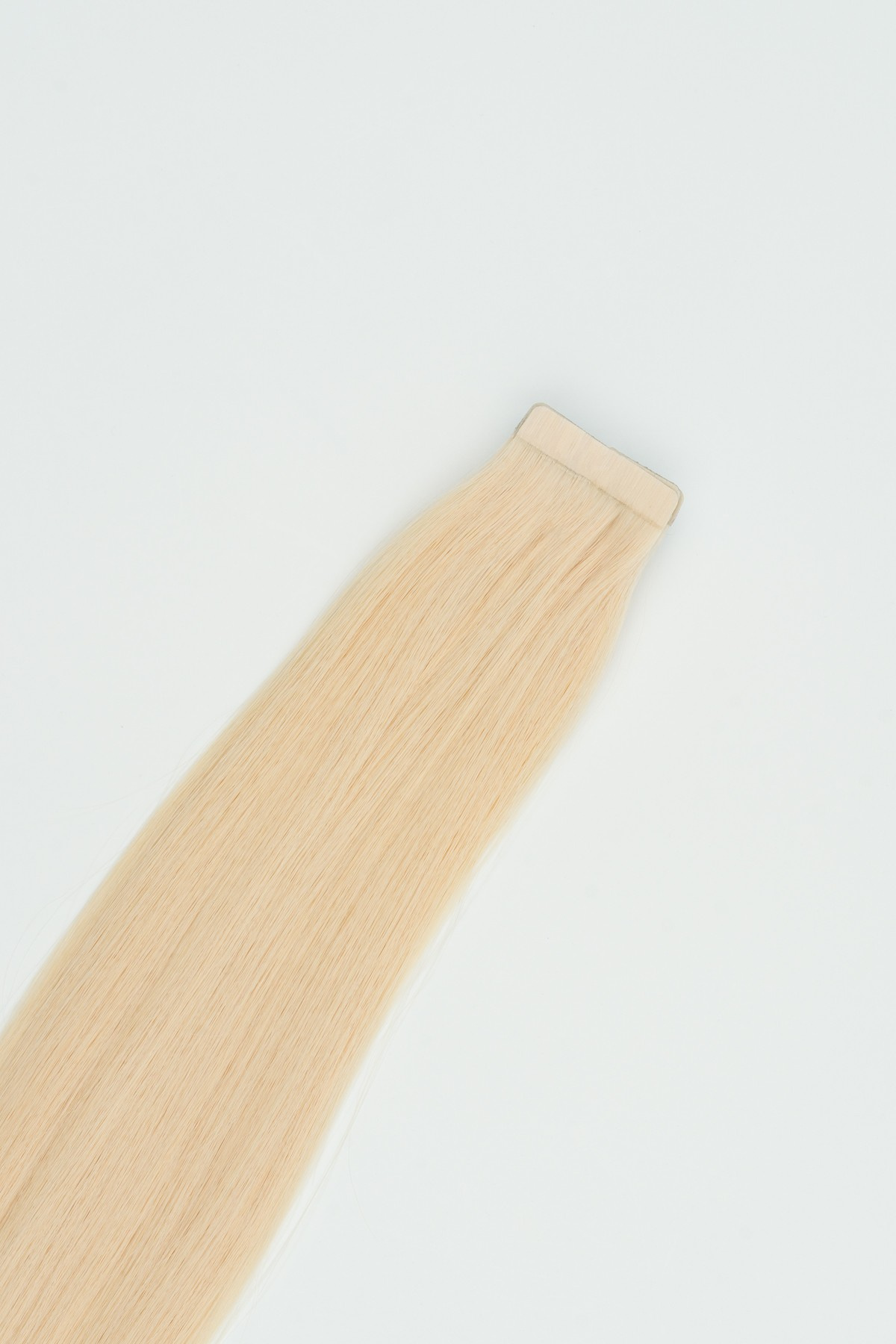 Die Anbringung erfolgt über die schonende Sandwich-Methode, ganz ohne Hitze, sodass das Eigenhaar nicht strapaziert wird. Eine Packung enthält 10 Tape-Strähnen à 2 g (Gesamtgewicht: 20 g) mit einer Tape-Größe von 4,0 x 0,8 cm. Jede Anwendung hält zwischen 8 und 10 Wochen und die Tapes lassen sich bis zu 3-mal wiederverwenden – für ein langfristig schönes Ergebnis.
